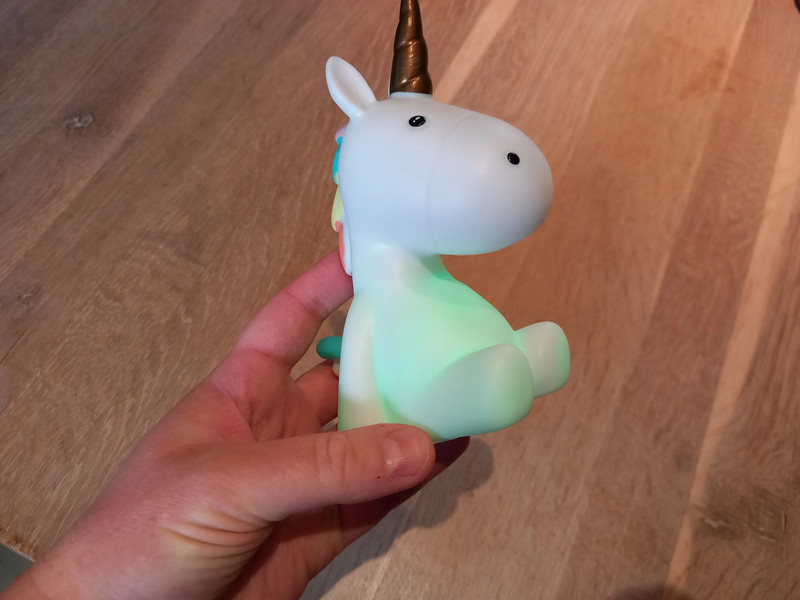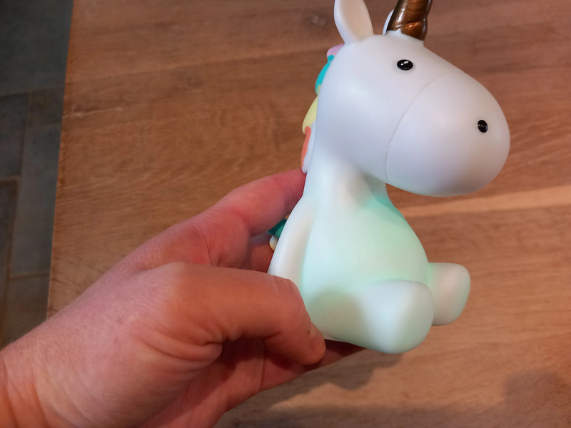 Petite Licorne lumineuse décorative, qui change de couleur au fur à mesure lorsqu’elle est allumée. Type veilleuse, elle sera idéale dans une chambre d’enfant.